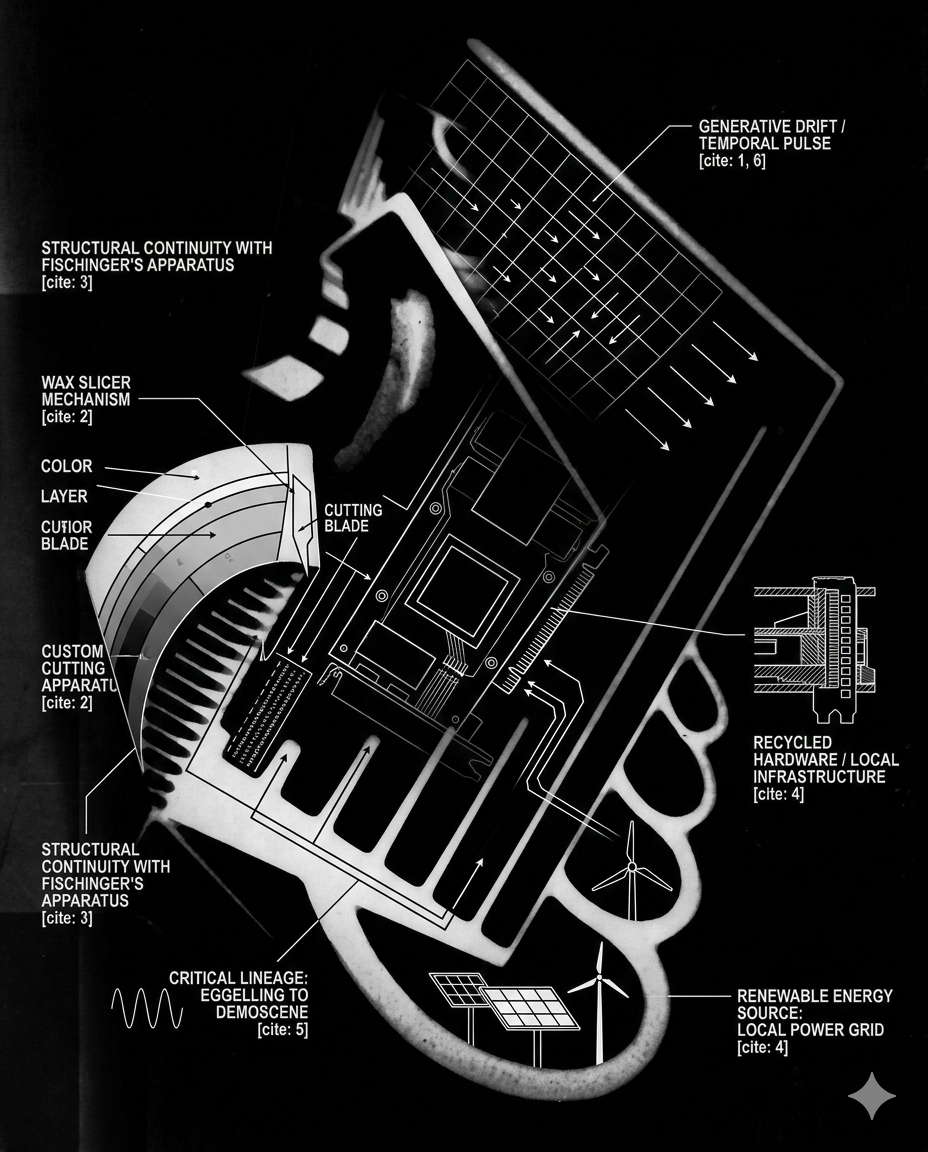 This text is a working document, written as part of my slow return to research after an extended period of medical leave. It is one of several threads I am weaving to better understand my own practice and to make explicit the ideas that underpin it. It lacks the footnotes and references I had intended to include. It is not a finished piece of scholarship but a foundation, an attempt to articulate, in continuous prose, the tradition I place myself within, the theoretical tools I draw on, and the material conditions I work under. It will change as the work progresses. What follows focuses on one concrete strand within that broader project: a lineage of non-narrative moving images and the infrastructural politics that accompany it. For a long time, I assumed that what follows was common knowledge. That if you worked with moving images, you would naturally know the names Viking Eggeling, Oskar Fischinger, and John Whitney Sr.; understand the history of structural film; and recognise that moving images need not tell stories to be meaningful. I assumed that most people working in this space grasped the politics of form and infrastructure as distinct from the politics of content, that when encountering a generative AI video that drifts and morphs, one might situate it within an established formal tradition rather than read it simply as a failed imitation of narrative cinema. I have come to accept that this frame of reference is no longer self-evident. The tradition I come from is deep and ongoing, yet it lacks institutional visibility. It is largely absent from art-school curricula, rarely cited in critical writing, and excluded from most funding frameworks for moving-image practice. Even when such practices exist, they are rarely recognised within galleries, funding categories, or scholarly discourse, leaving this formal-political potential underdeveloped. The following text attempts to render this lineage visible again and to argue that it still holds crucial potential for contemporary image-making. Eggeling’s Symphonie Diagonale (1924) and Hans Richter’s Rhythmus 21 (1921) were produced before narrative cinema had fully consolidated its conventions. These works proposed that film could function like music or painting—temporal, formal, and composed—without being narrative. The image was treated as a plastic material to be organised in time, not as a window onto a fictional world. In Symphonie Diagonale, Eggeling choreographed geometric forms that transform according to visual rules—growth, contraction, rotation, mirroring—applied rhythmically across time. Fischinger extended this principle across three decades, synchronising abstract animation with musical forms. He was not only an artist but an engineer. For the Wax Experiments (1921–26), he constructed a mechanical apparatus that sliced and photographed blocks of wax, generating images through a material process rather than through manual drawing frame by frame. The device was not simply a tool; it was a system whose operation produced imagery within designed constraints. Fischinger’s authorship lay in setting the parameters and conditions; the work emerged from the operation of this engineered situation. That description resonates with the conditions of contemporary generative image-making. When I train a diffusion model on a dataset of objects I have selected and photographed, and run it locally on recycled hardware powered by renewable energy, I am engaged in a structurally comparable practice. I design the system—curate the data, configure the training, assemble the computational infrastructure—and the system produces images. Authorship resides not in producing each individual frame, but in shaping the conditions under which images come into being. The traditional distinction between building the instrument and playing it becomes unstable when instrument and performance are so tightly coupled. Fischinger’s work was political in ways that remain pertinent. He left Nazi Germany in part because the regime demanded figurative, narrative imagery that served propagandistic ends. Abstraction, in this context, was not a retreat from politics but a refusal to let form be subordinated to ideological messaging. Today a comparable pressure is visible: the expectation that moving-image work must carry recognisably political content—revealing, testifying, or exposing injustice—to be considered serious. This insistence on explicit political content reproduces a similar logic of instrumentalisation. Work that resists this mandate, focusing on formal or structural inquiry, is often misread as apolitical. Fischinger’s synthesis of art and engineering also constituted a quiet refusal of industrial divisions of labour. When I operate my own AI infrastructure rather than renting access to commercial APIs, I inhabit a related structural position. The politics is embedded in the practice of integration. Running a model locally, on my own hardware and datasets, constitutes a refusal of the centralised political economy of computation, echoing Fischinger’s return to independent production after unsuccessful engagements with Disney or Paramount. This does not romanticise independence as purity; rather, it keeps the question of who controls the apparatus materially present. Energy use forms part of this equation. Computation is materially expensive, and the environmental burdens of that expense are politically distributed. Running a model on renewable energy from a known grid is not an “ethical decoration”; it is an assertion of responsibility for the entire production chain. To obscure those relations behind a cloud interface is to reproduce the same opacity that characterises industrial image production. Conventional art-historical narratives often suggest that this abstract tradition was simply displaced by narrative cinema. That account overlooks the actual paths through which forms travelled. Fischinger’s influence on Walt