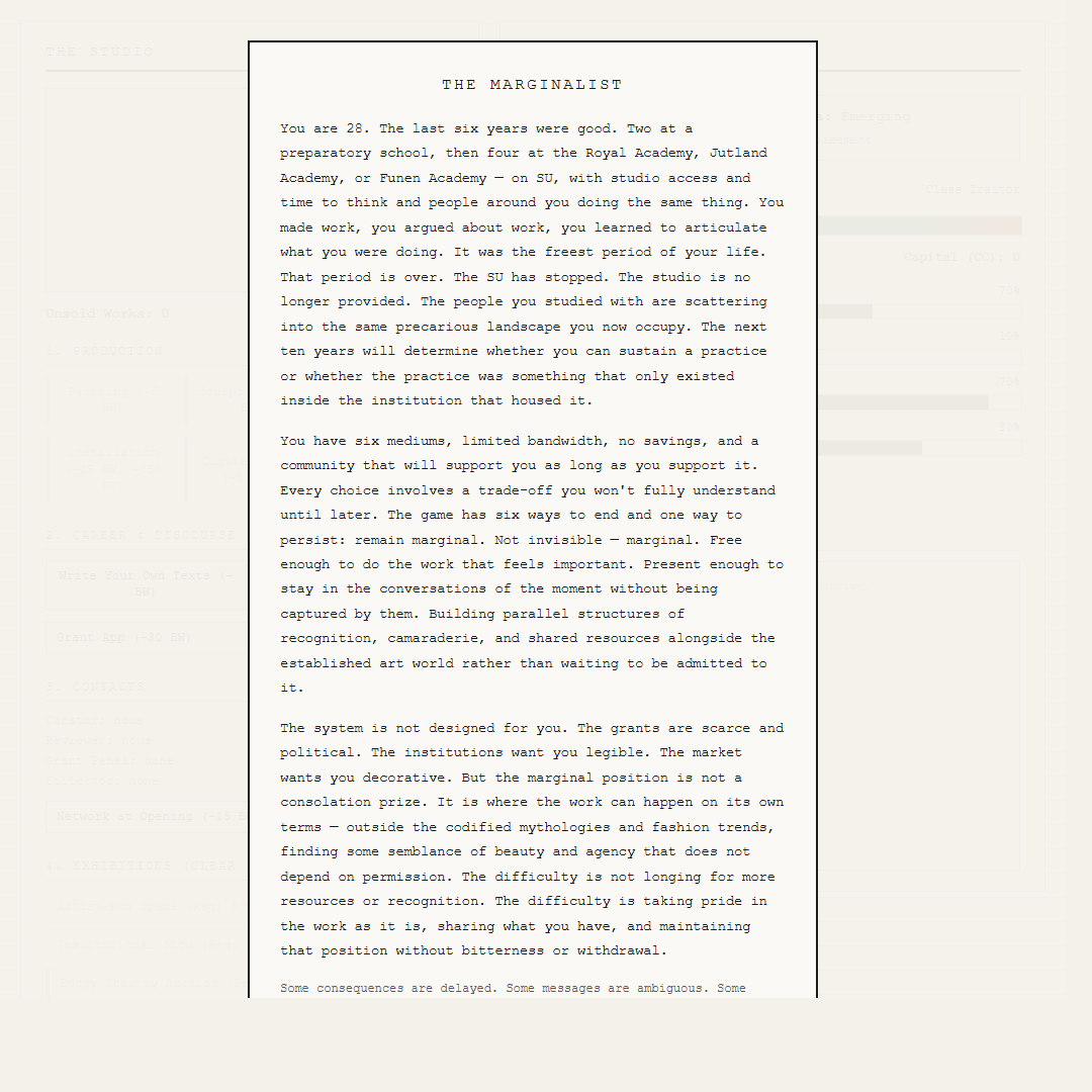 The game looks like a paper form — ruled lines, monospaced type, square corners; the aesthetic of ledgers, index cards, and grant applications filled out by hand. Sixteen randomised starting backgrounds shape where you begin: whether you grew up in an art family or a working-class household, whether you studied at the Royal Academy or taught yourself over fourteen years of evenings, whether you arrived from abroad with no network, graduated into debt your parents took on, or are raising a child alone with the nursery closing at four.